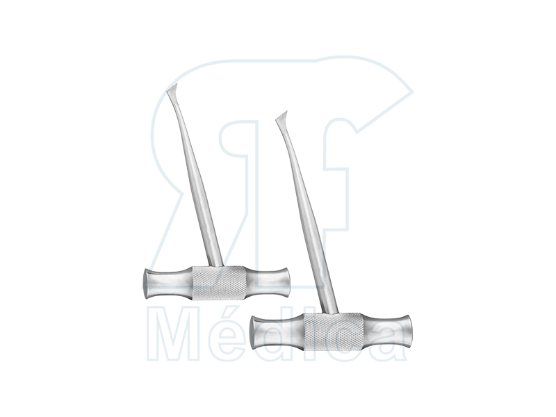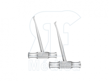 Elevador de raíces con mango ergonómico y punta resistente, ideal para procedimientos de exodoncia en caninos.